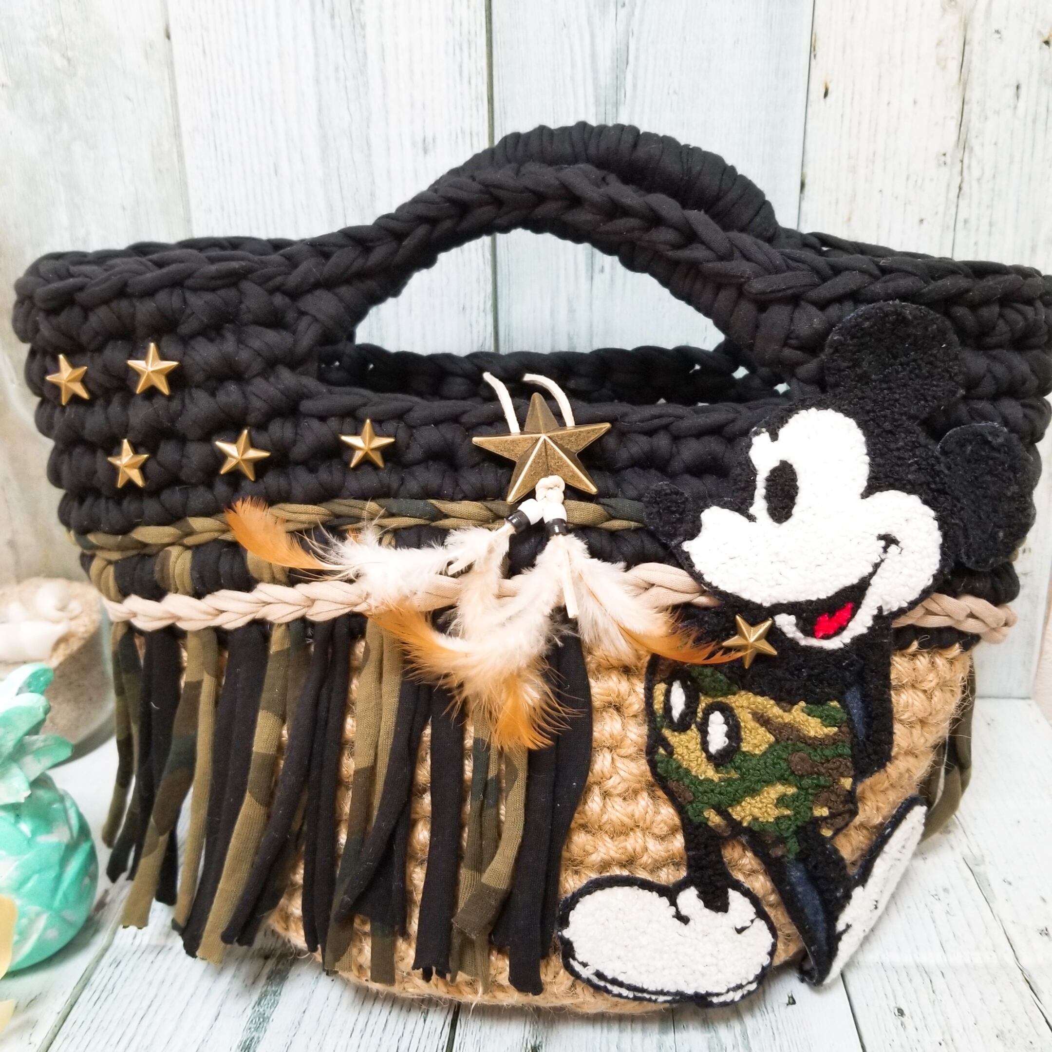 ズパゲッティバッグ 麻ひも×ミッキーワッペン リメイクバッグ
